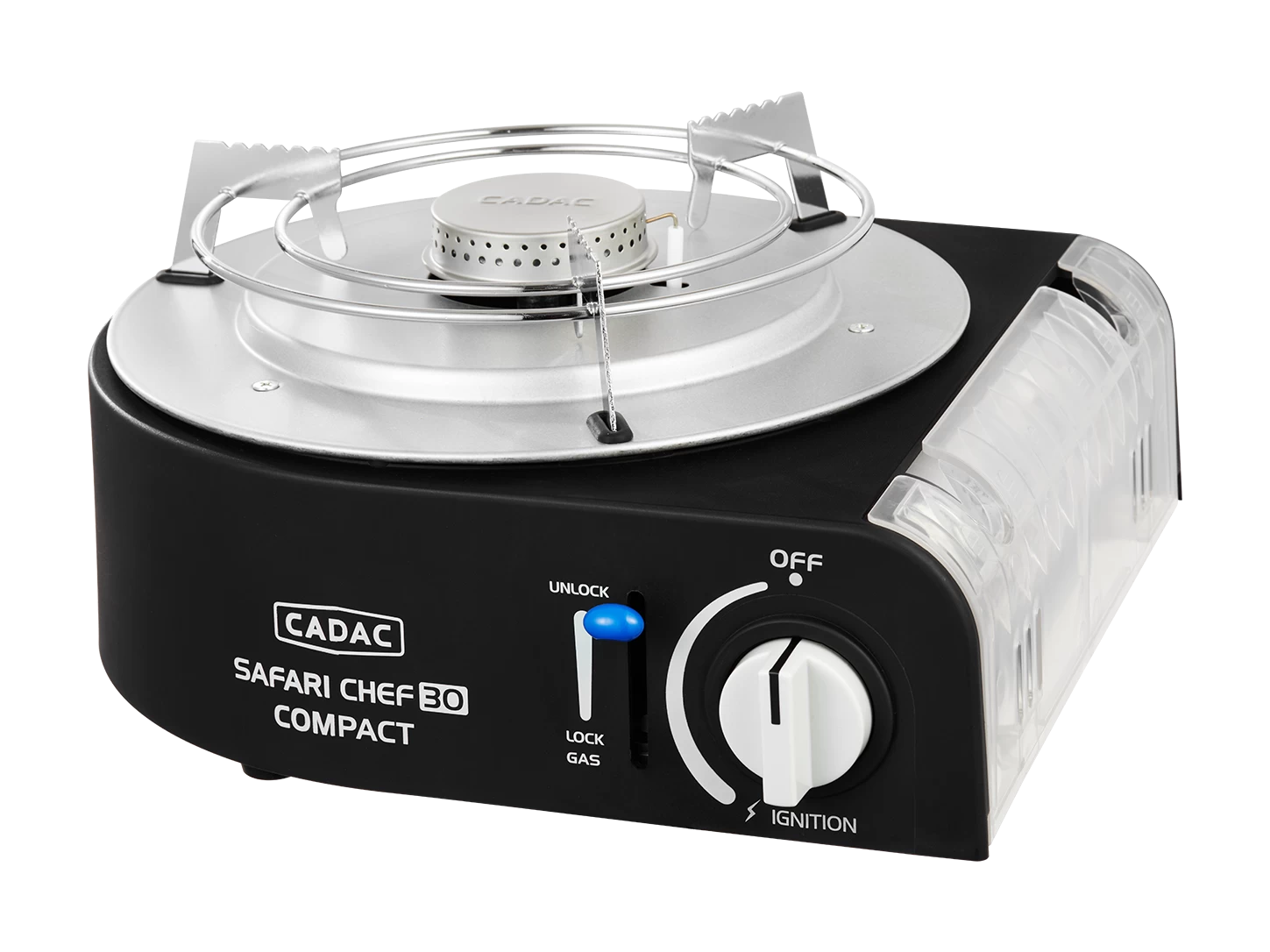 Despite its small size, the Safari Chef Compact is extremely versatile due to the various cooking tops included; a pot stand, BBQ grid, flat plate and pot/lid. Use the pot stand to cook a pot of soup or pasta. The BBQ grid and flat plate have CADAC’s GreenGrill coating and are perfect for baking and grilling meat, fish and vegetables. The lid can also be used as a pan and is therefore multifunctional.