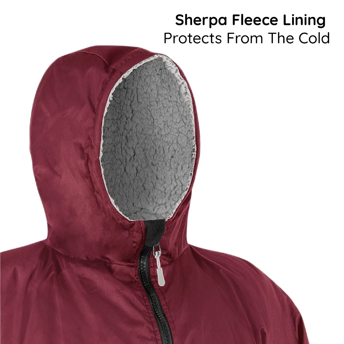 - Waterproof and windproof dry robe made with polyester outer and Sherpa fleece fabric inner lining to keep you dry and warm in wet and windy weather
