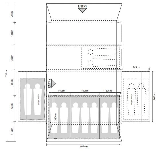 - Footprint 705 x 445cm (Main body) + 245 x 145cm x 2 (Side Annexes)