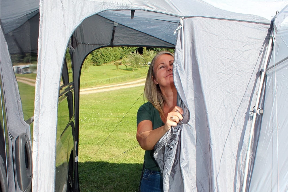 The excellent value lightweight Cayman F/G pole and sleeve drive-away awning remains the most popular upper entry level small family weekender on the market. With just 2 fibreglass poles used to create the main body of the awning it is quick and easy to pitch, and structurally very stable. The unique design means this is one of the most versatile drive-aways on the market, offering access from all sides of the awning through the large roll back doors. New for 2021 is the option to zip a Bedroom Annex to the back of the awning, meaning your main living space is not affected if you are looking to add sleeping space. Available in 3 ergonomic cowl heights to suit the vast majority of campervans & motorhomes, the Cayman F/G offers unrivalled value for money. Including a ‘fold-flat’ sewn-in groundsheet, and lots of ventilation with plenty of mesh fly screen panels, this is the awning of choice for smaller touring families, couples or independent adventurers, who crave more usable space alongside their van, to meet a budget.