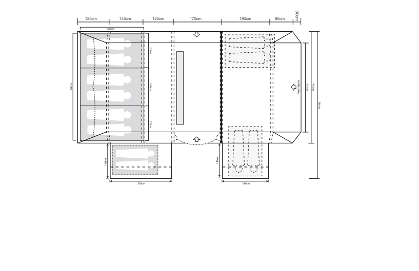 The Ozone 8.0 Safari Lodge integrates every popular innovation found on its predecessor, such as the double width side access doors on each side of the tent, the unique sewn-in front porch groundsheet, a wealth of mesh ventilation including a removable central door panel with mesh windows, and darker ‘Twilight’ bedroom inners to name a few. One important feature of ‘The Lodge’ is the separation of bedroom options, effectively offering a total of 4 completely detached and separate sleeping areas, great for families or groups who want their own space.