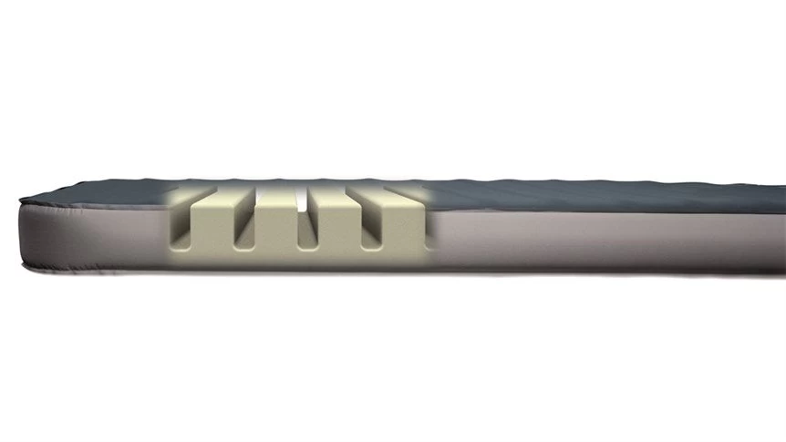 Ingenious heat regulation is achieved through offset air core sculpting which enables greater or less body heat retention depending on which mat side is slept on – a real performance boost when needed for optimum year round comfort. When the mat is turned with the air cores next to the body excessive heat can escape making it easier to cool down during warm summer nights. When the mat is turned the opposite way it gives the user the optimal insulation as the body heat is reflected by the foam. This option is used in colder nights. This air core design also offers campers a softer sleep sensation as well as better ease of packing, lower weight and neater packed size.