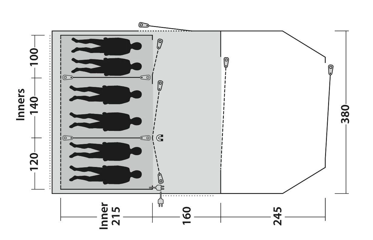 Sleeping six in three Premier Bedrooms with Dark Inners and Outwell Quick & Quiet Inner Doors, Norwood 6 offers versatile space in three zones, ideal for active campers seeking flexible tent living. The wide front of the light-filled design, with steep sides and front for maximum usable space, the Outwell HookTrack System, Rear Ventilation System, D-door and side door ensure practical camping comfort.